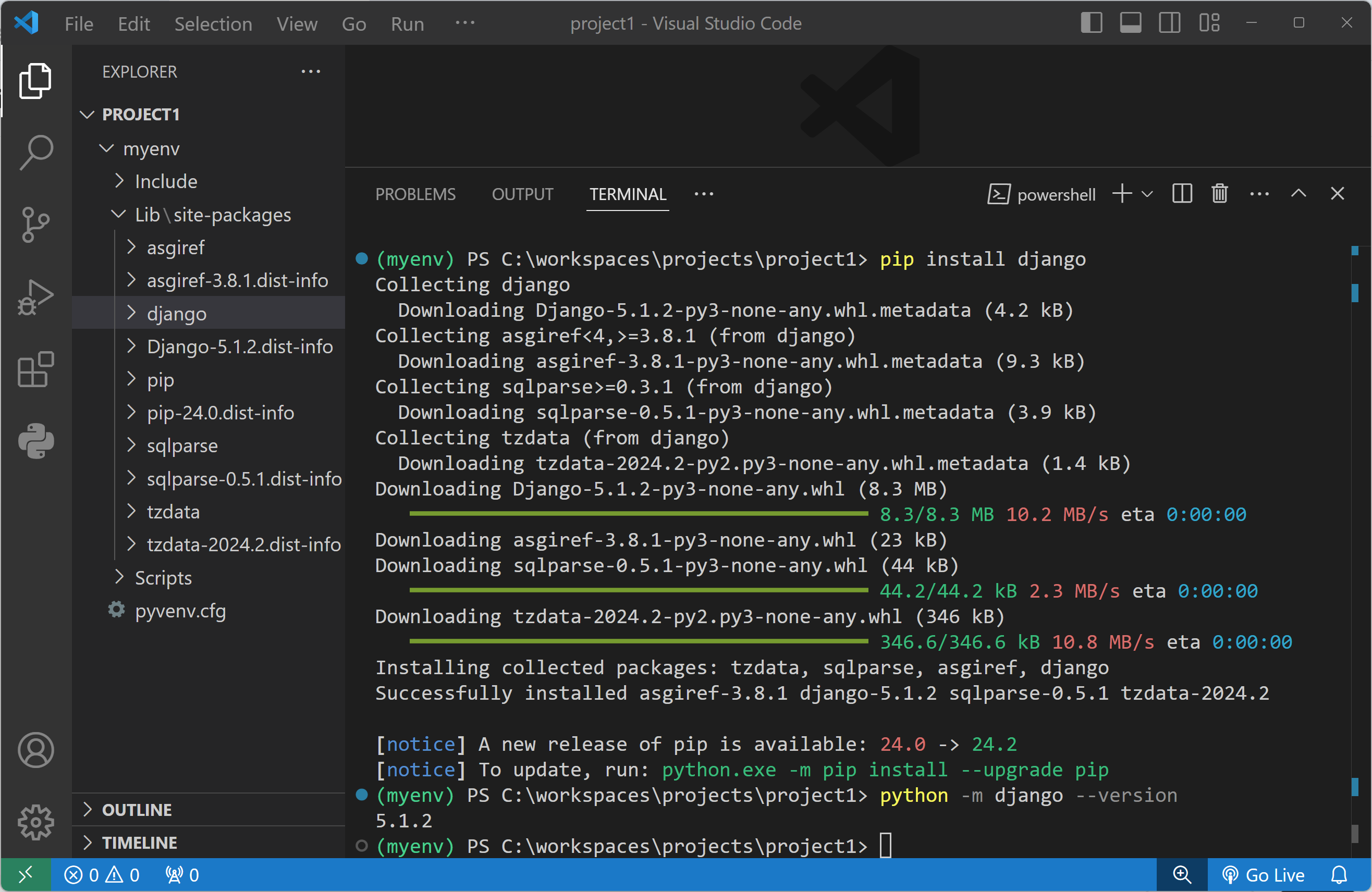 장고를 설치한 후 다시 버전을 확인해 보면 5.1.2이 설치된 것을 알 수 있습니다.