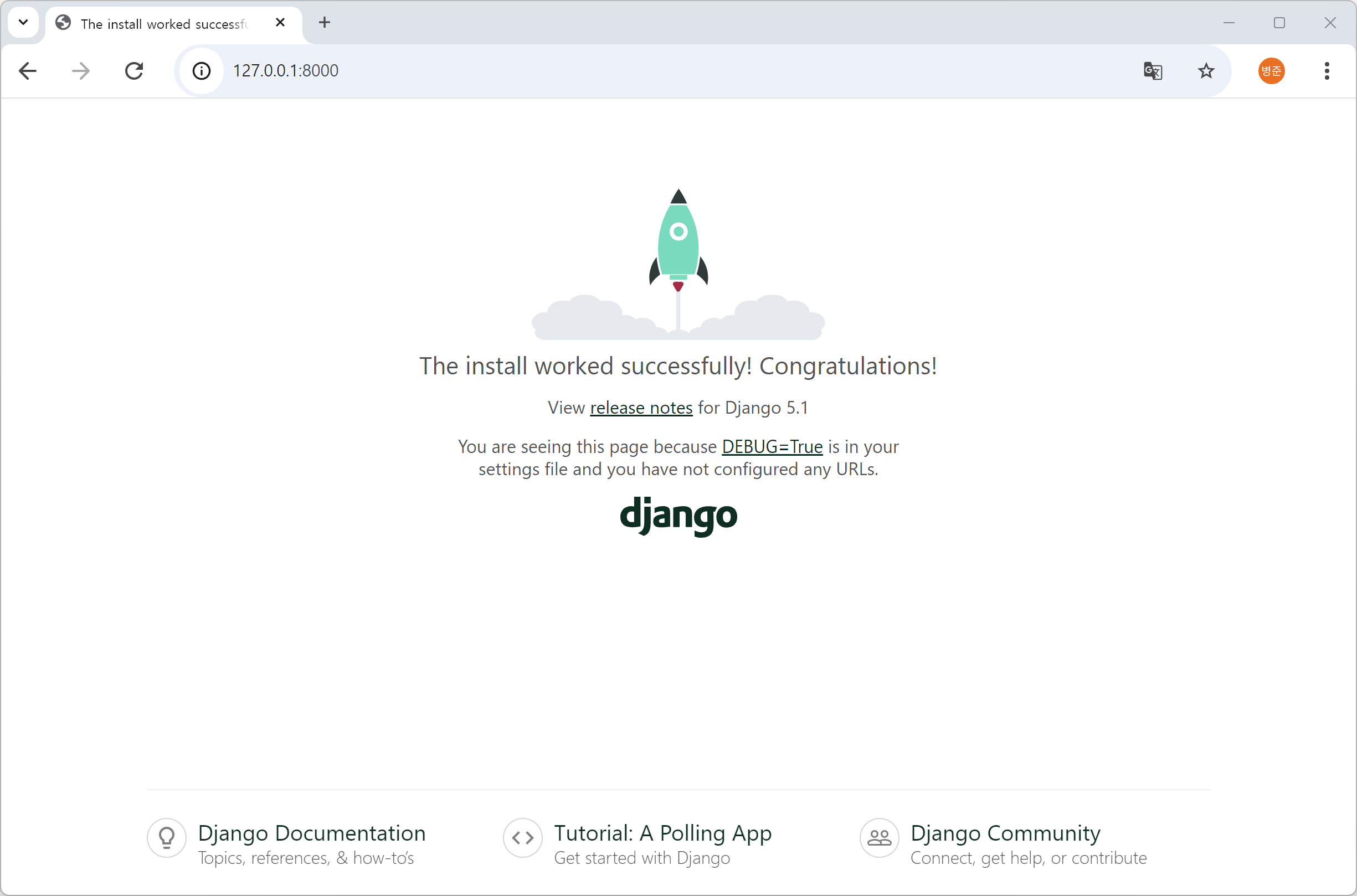 2. 웹 브라우저에서 "http://127.0.0.1:8000/"를 입력합니다.
