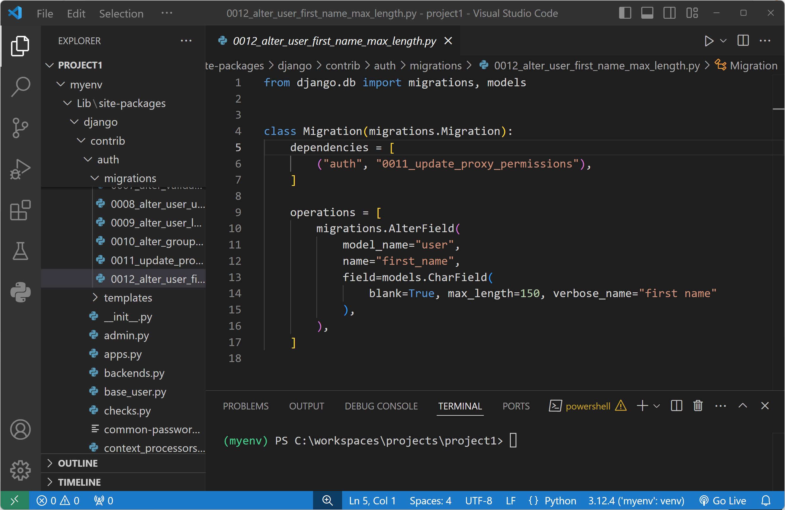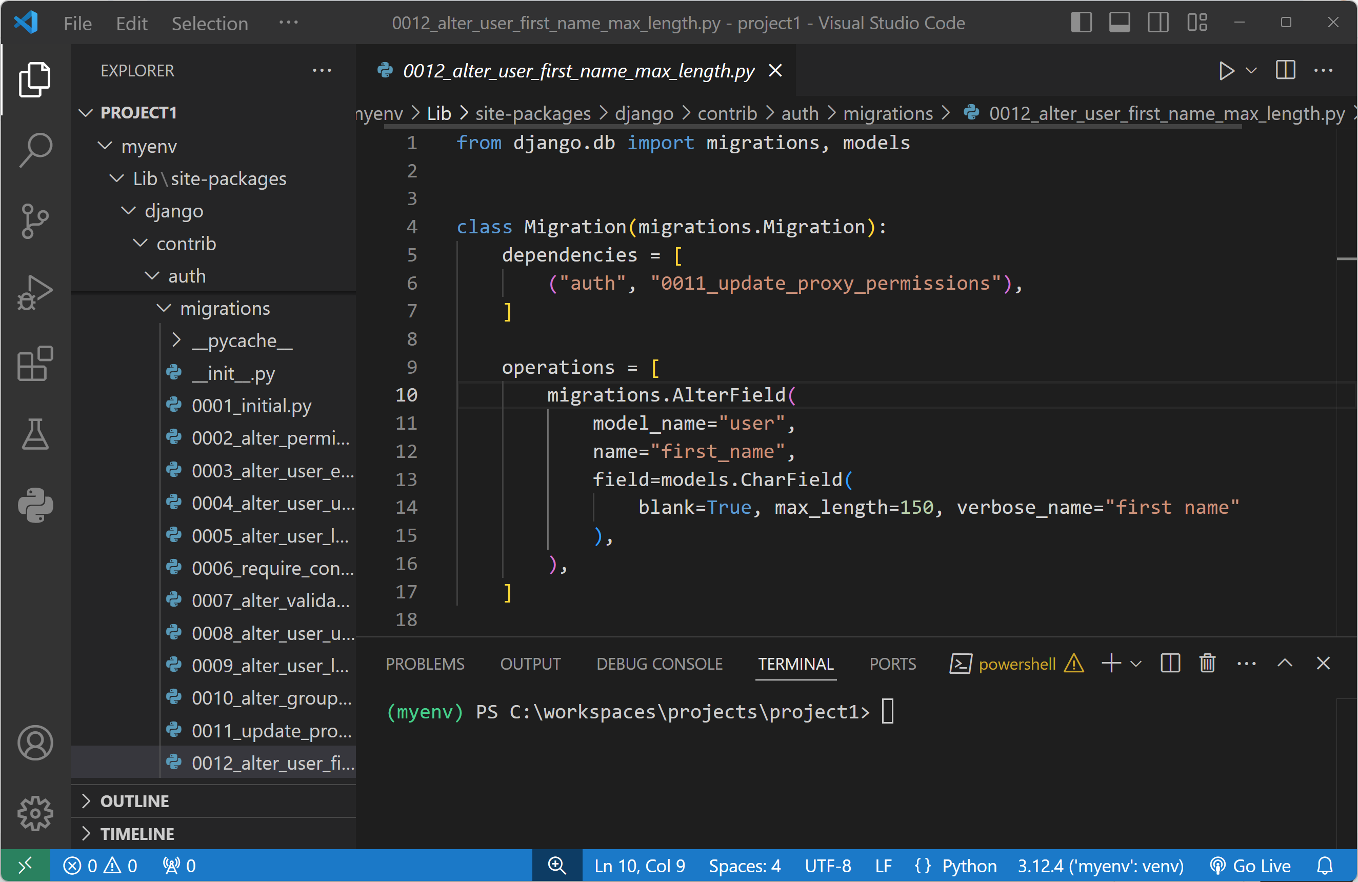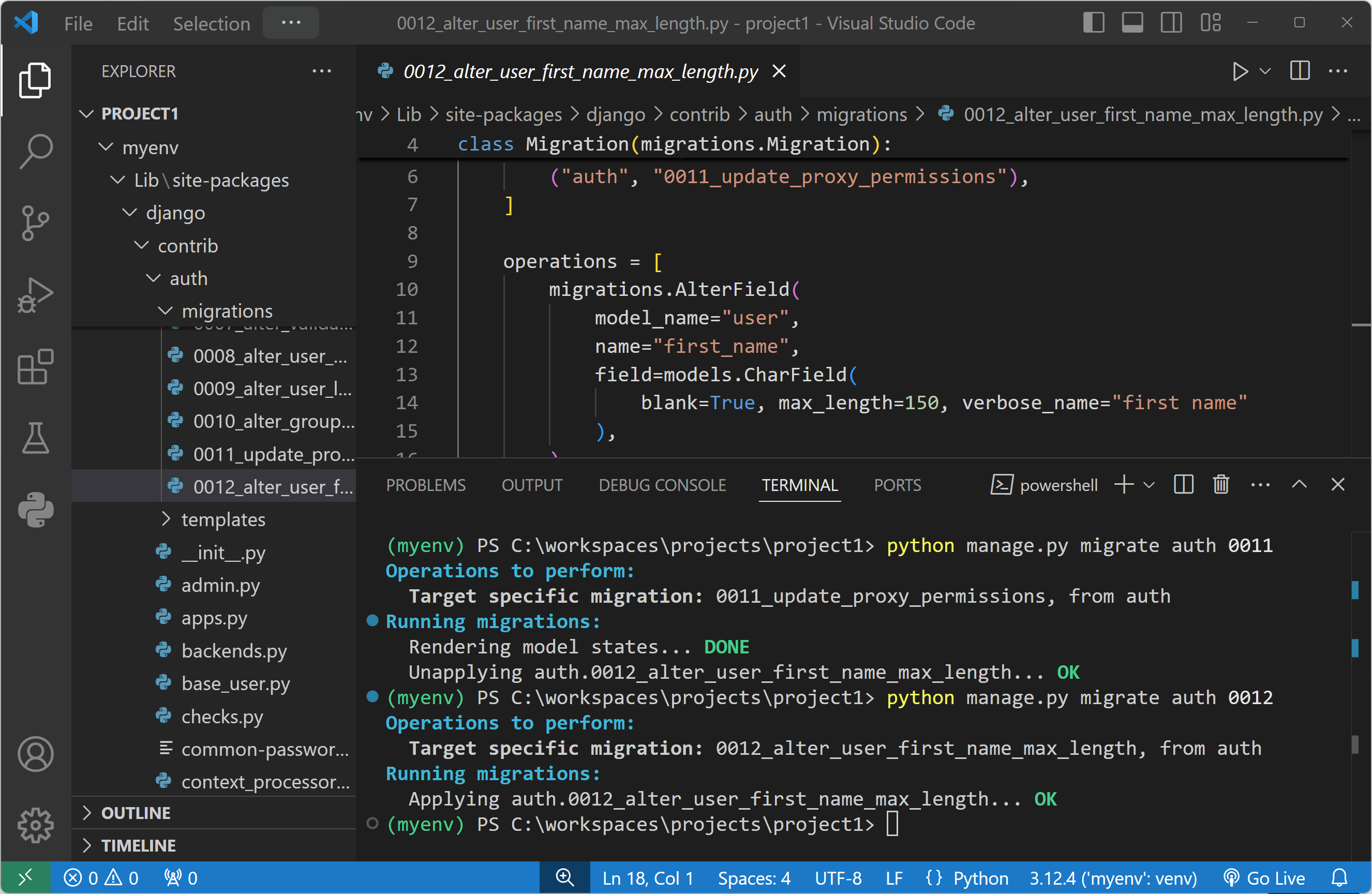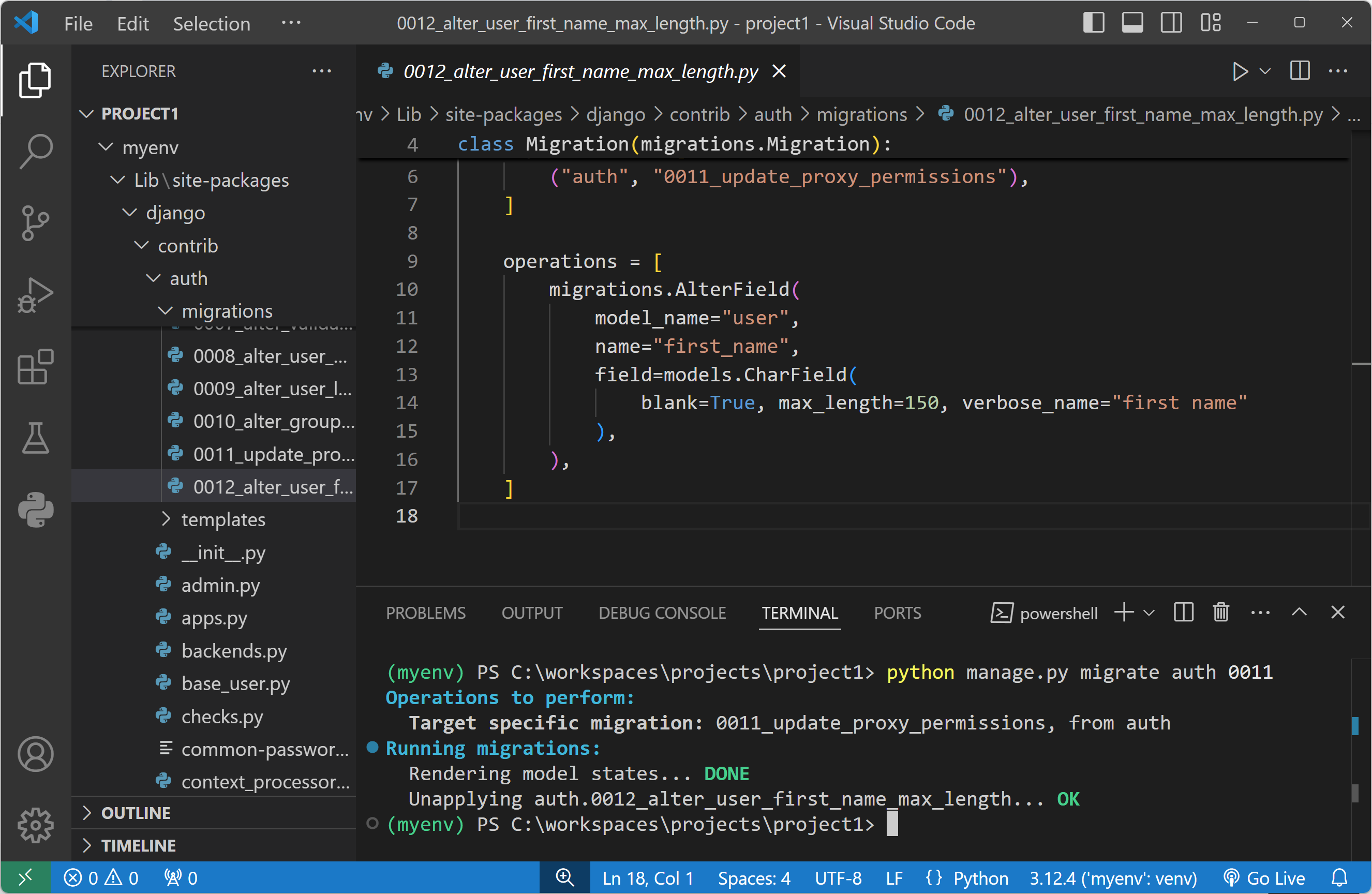 다음처럼, auth 앱은 처음 마이그레이션(0001_initial.py) 한 후 11번을 수정(0012_alter_user_first_name_max_length.py) 한 것을 알 수 있습니다.