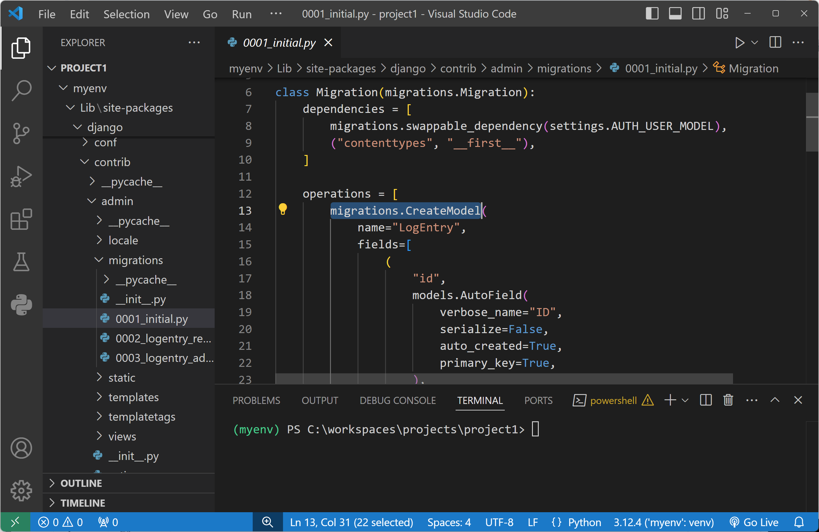 예를 들어, 모델이 추가되면 마이그레이션 클래스의 오퍼레이션에 migrations.CreateModel 클래스로 테이블과 테이블의 필드를 추가할 수 있습니다. (admin의 LogEntry 모델에 대한 마이그레이션 파일입니다.)