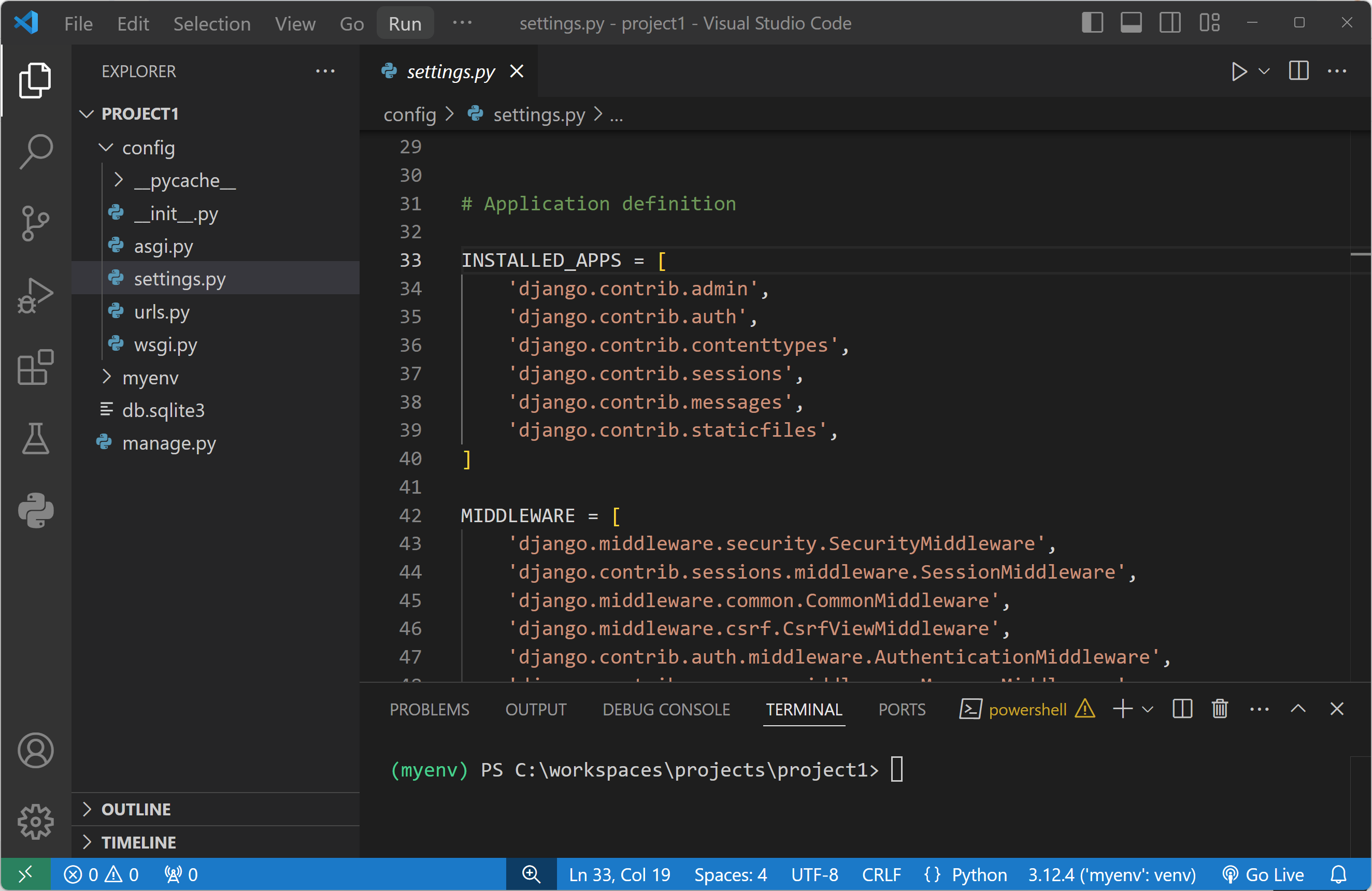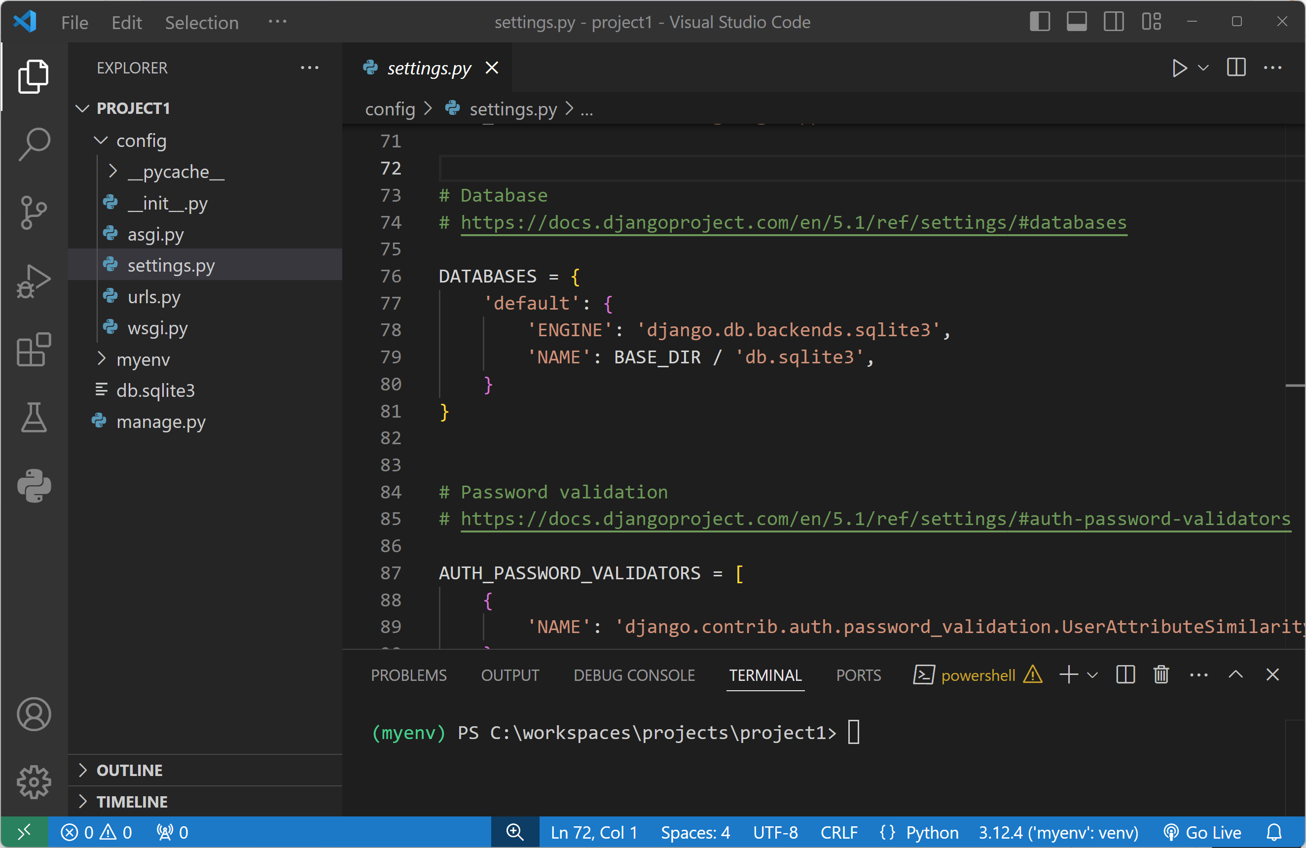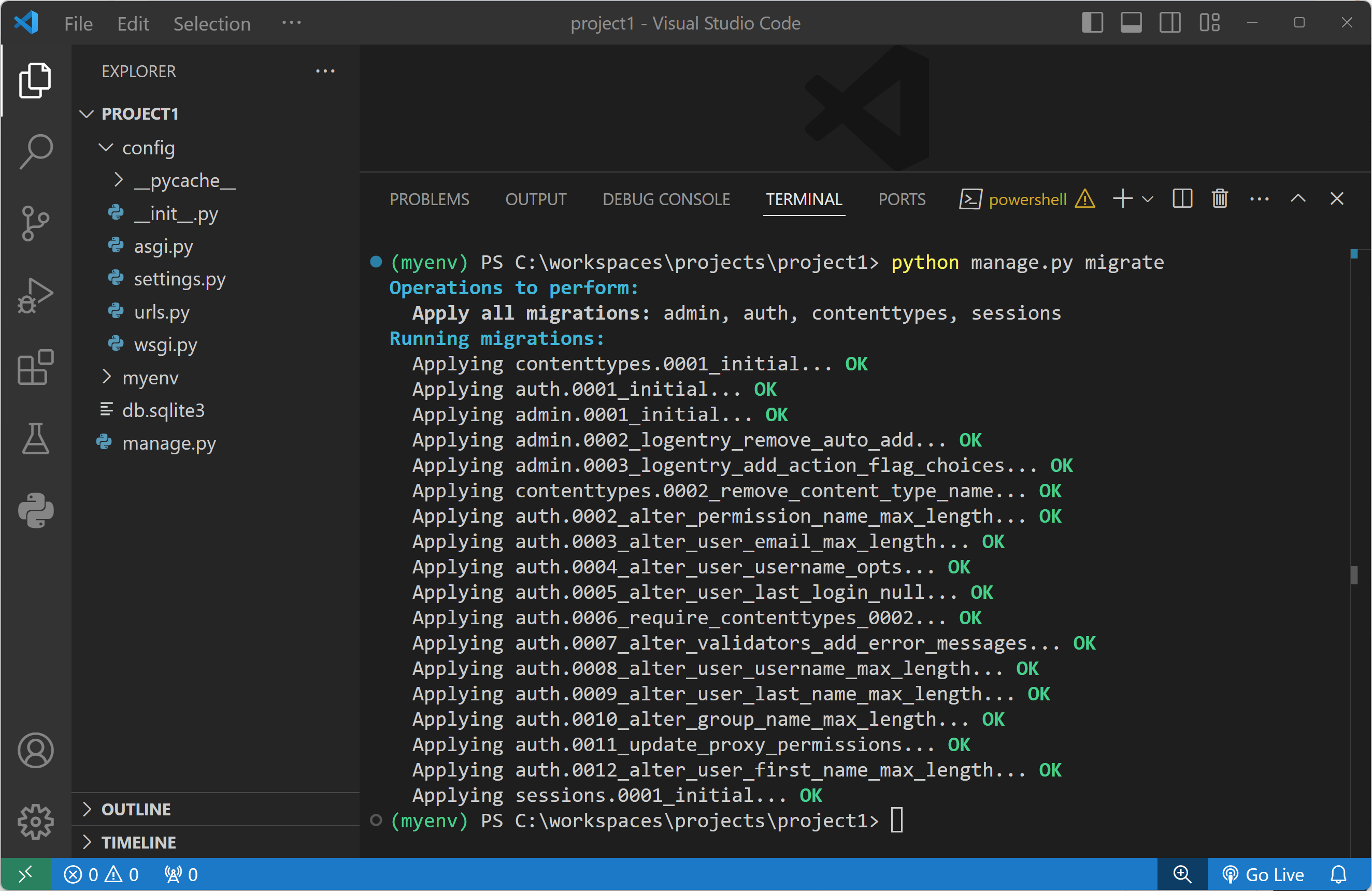 왼쪽 EXPLORER를 보면 db.sqlite3 파일이 추가된 것을 확인할 수 있습니다.