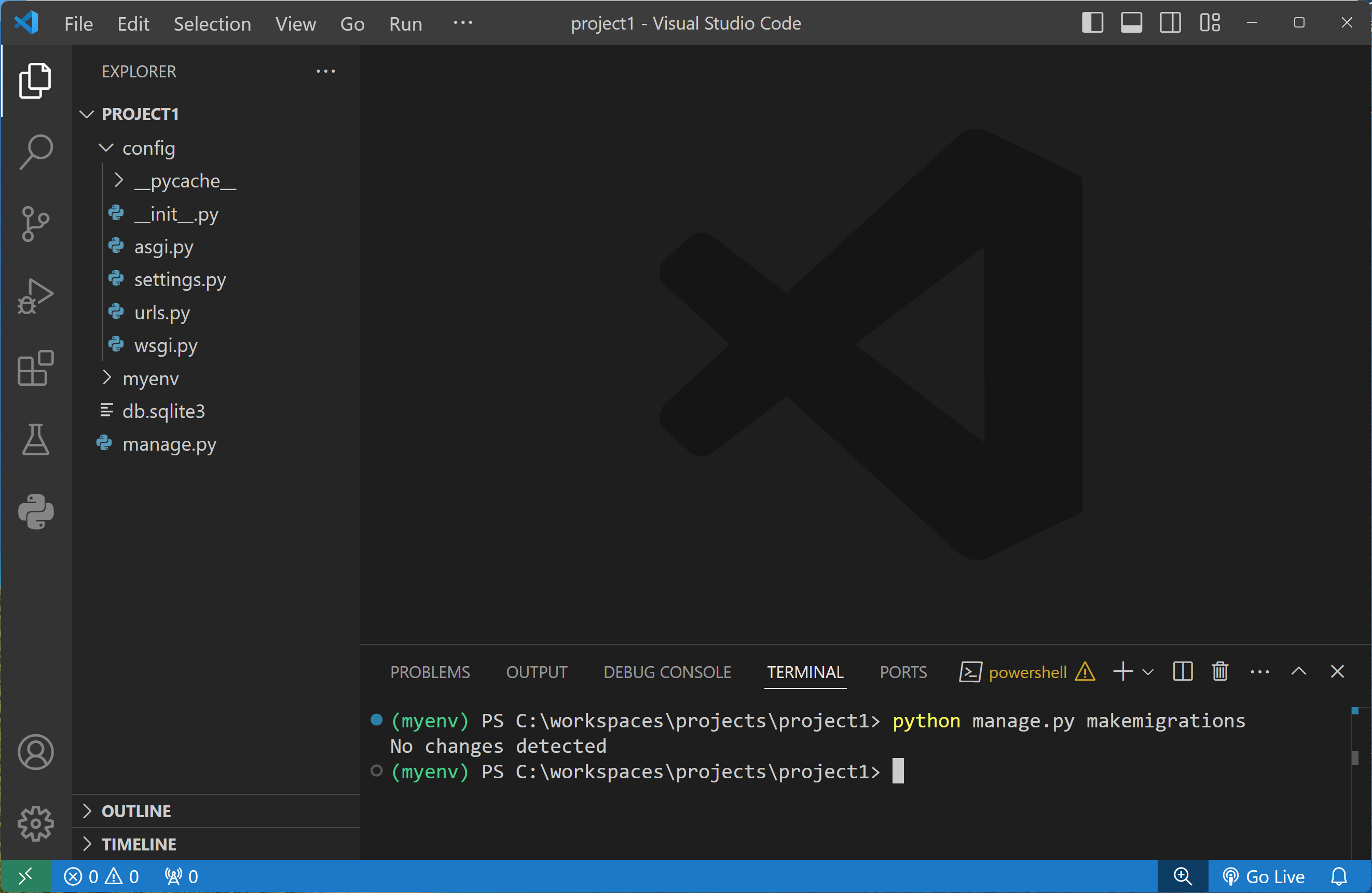 makemigrations를 실행하면 터미널(Terminal)에 No changes detected (감지된 변경이 없습니다.)라고 나옵니다.