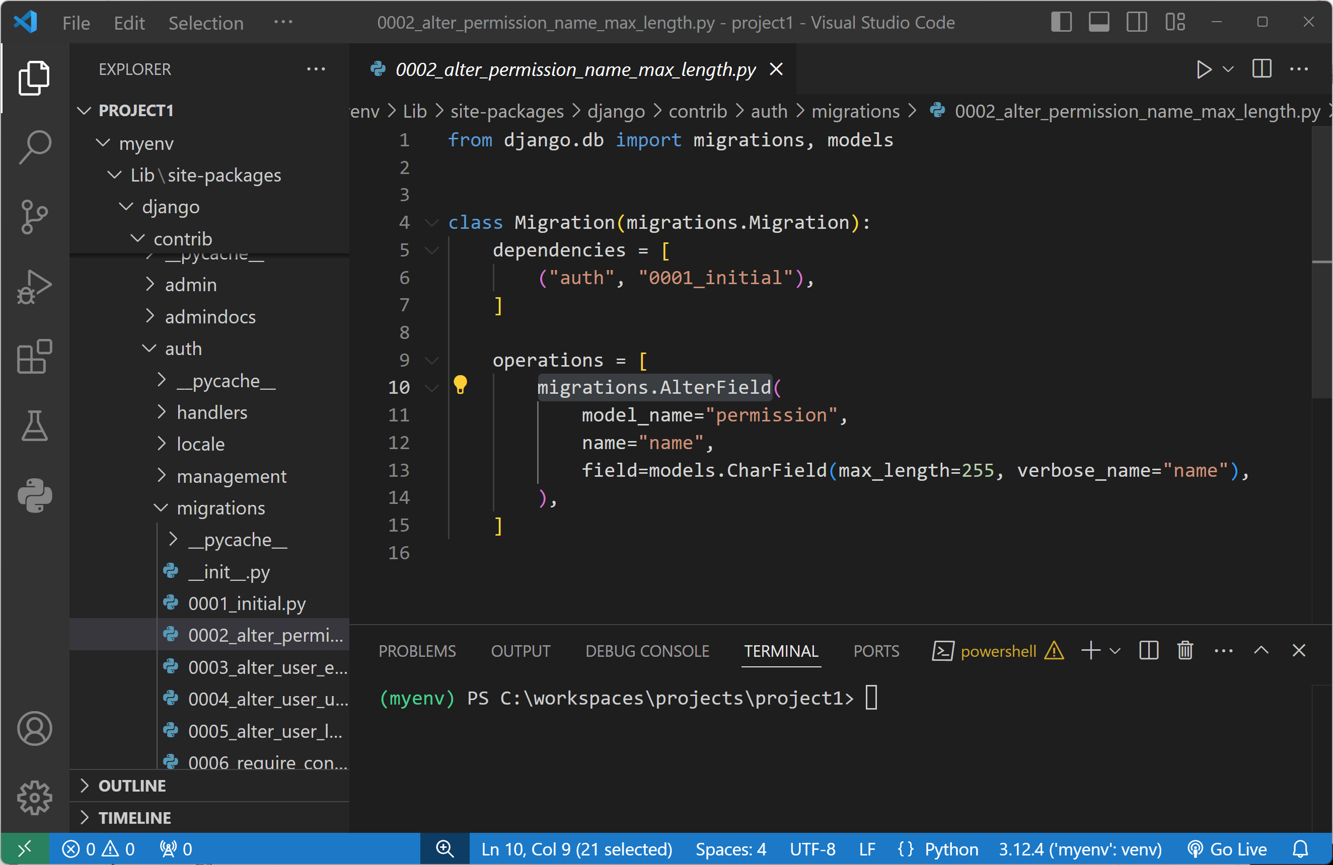 예를 들어, 모델이 수정되면 마이그레이션 클래스의 오퍼레이션에 migrations. AlterField 클래스로 테이블의 필드를 수정할 수 있습니다. (auth의 Permission모델에 대한 마이그레이션 파일입니다.)