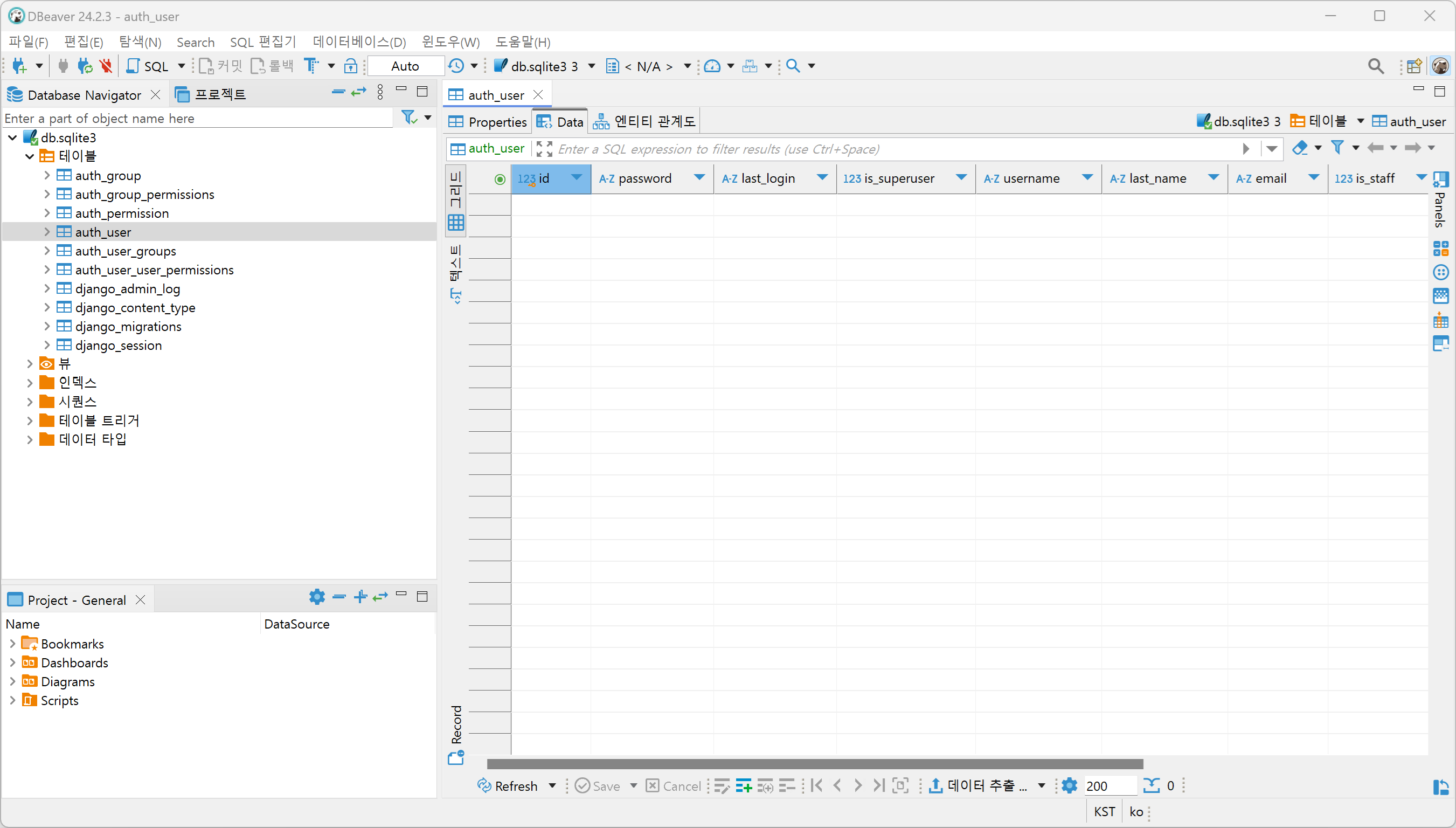 DBeaver로 db.sqlite3 파일을 오픈해 보면 장고 관리자 테이블들이 생성된 것을 확인할 수 있습니다.