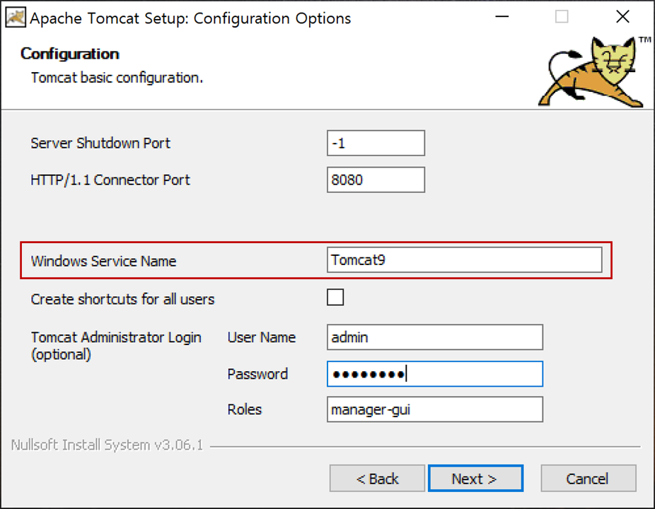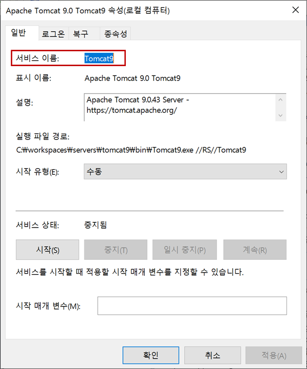 앱 이름에서 "Apache Tomcat 9.0 {서비스 이름} (remove only)"으로 서비스 이름("Tomcat9")을 확인할 수 있습니다.