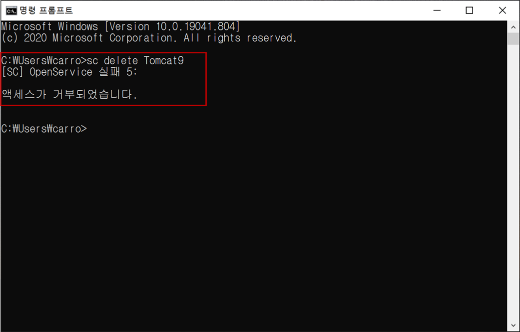 "sc delete Tomcat9"를 입력하고 엔터를 클릭하면 서비스(service)가 삭제됩니다.