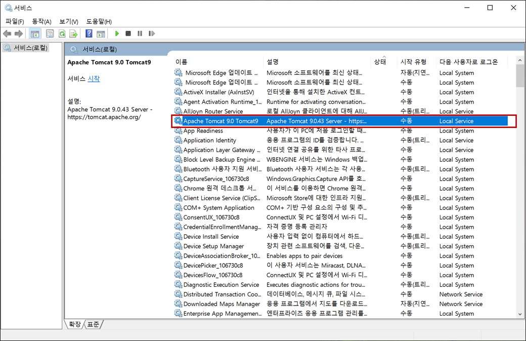 2. 서비스에서 "Apache Tomcat 9.0"으로 시작하는 서비스를 찾아 더블클릭합니다.