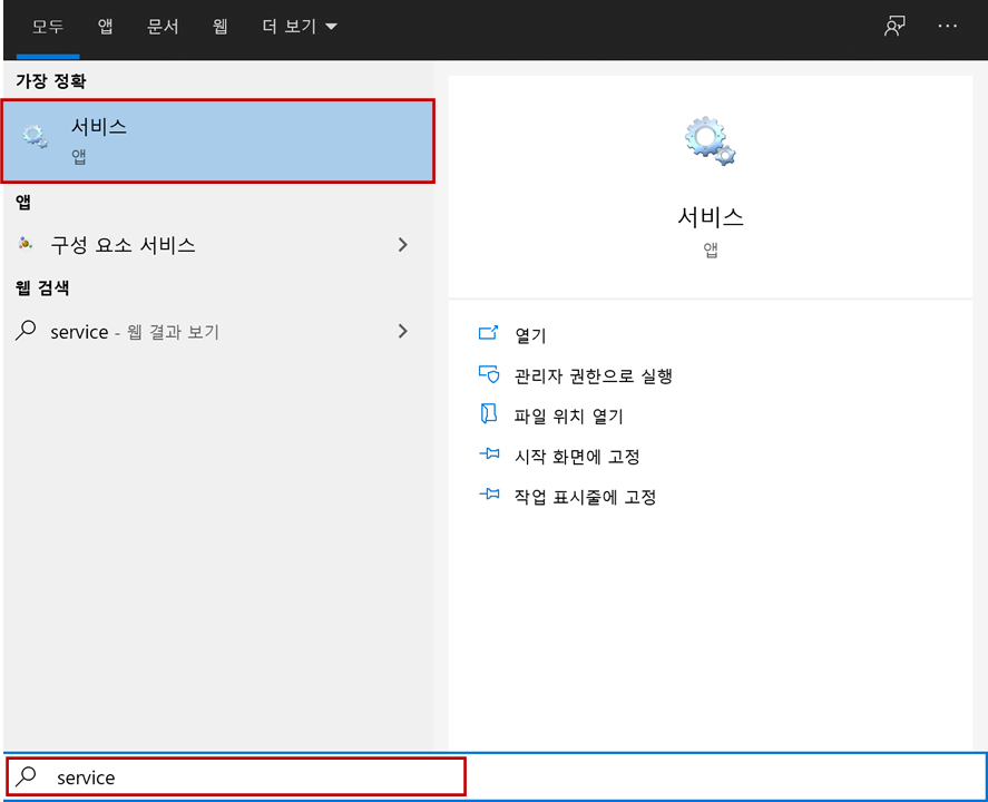 1. 윈도우 "시작"(start) 버튼을 클릭하고 "스페이스 바"(Space Bar)을 클릭합니다. 입력창에 "서비스"입력 후 "서비스"를 클릭합니다.