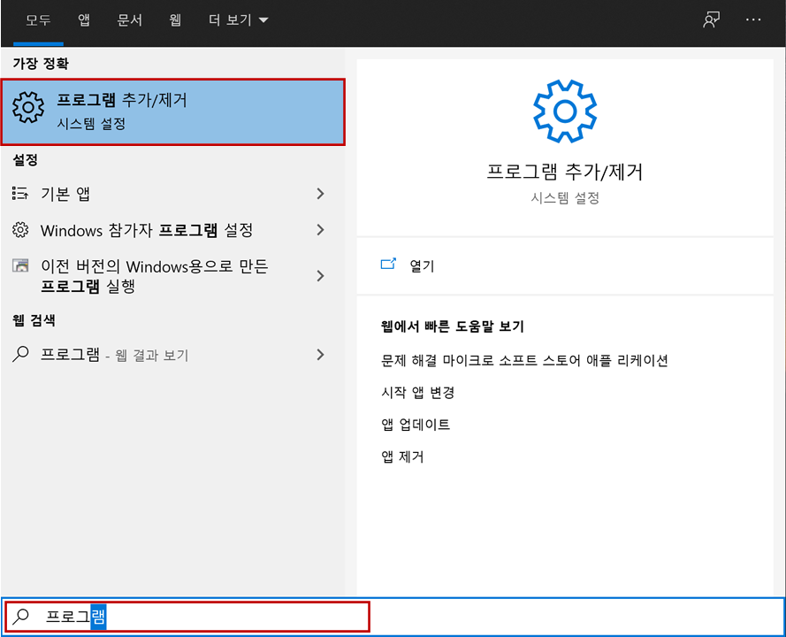 1. 윈도우 "시작"(start) 버튼을 클릭하고 "스페이스 바"(Space Bar)을 클릭합니다. 입력창에 "프로그램"입력 후 "프로그램 추가/삭제"를 클릭합니다.