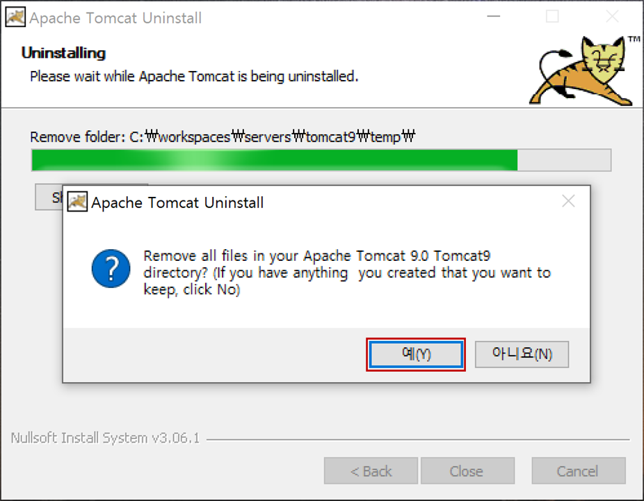 4. 톰캣 9.0 관련 모든 디렉터리와 파일 삭제 여부를 물어보는 확인창이 나타납니다.