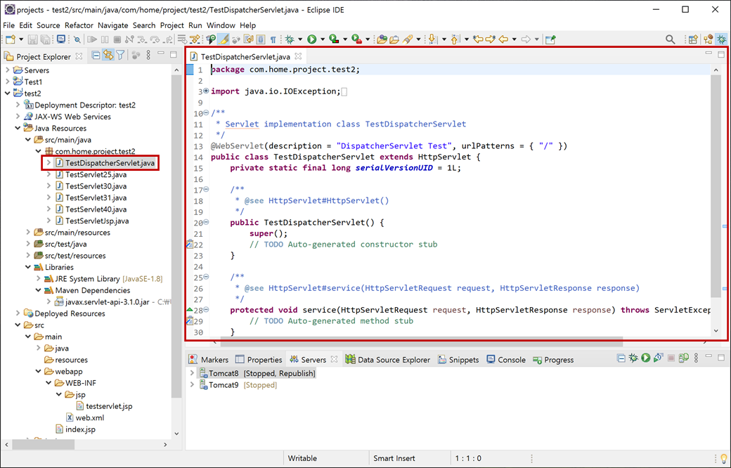 "web.xml"에서 구성하고 싶다면 "TestDispatcherServlet.java"에 "@WebServlet" 어노테이션을 삭제한 후 "web.xml"에 다음과 같이 추가하면 됩니다.