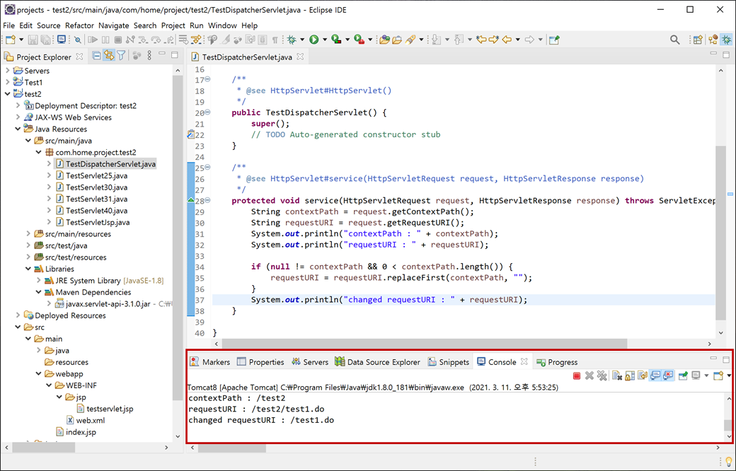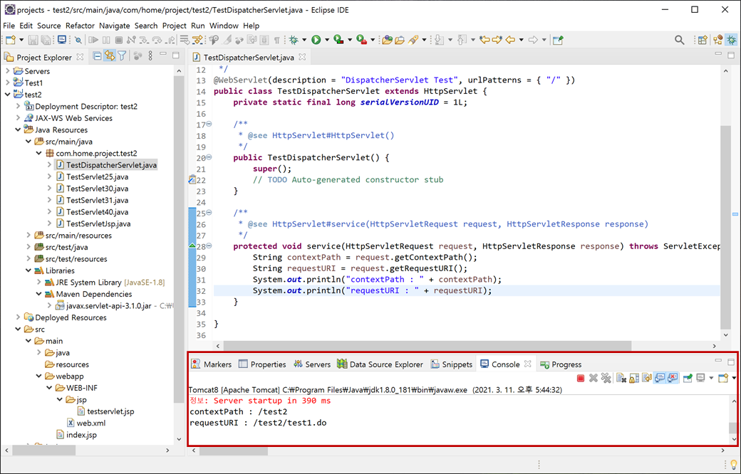 현재 "Dynamic Web Module 3.1"로 구성되어 있어 "TestDispatcherServlet.java"에 "@WebServlet" 어노테이션을 사용하고 있습니다.