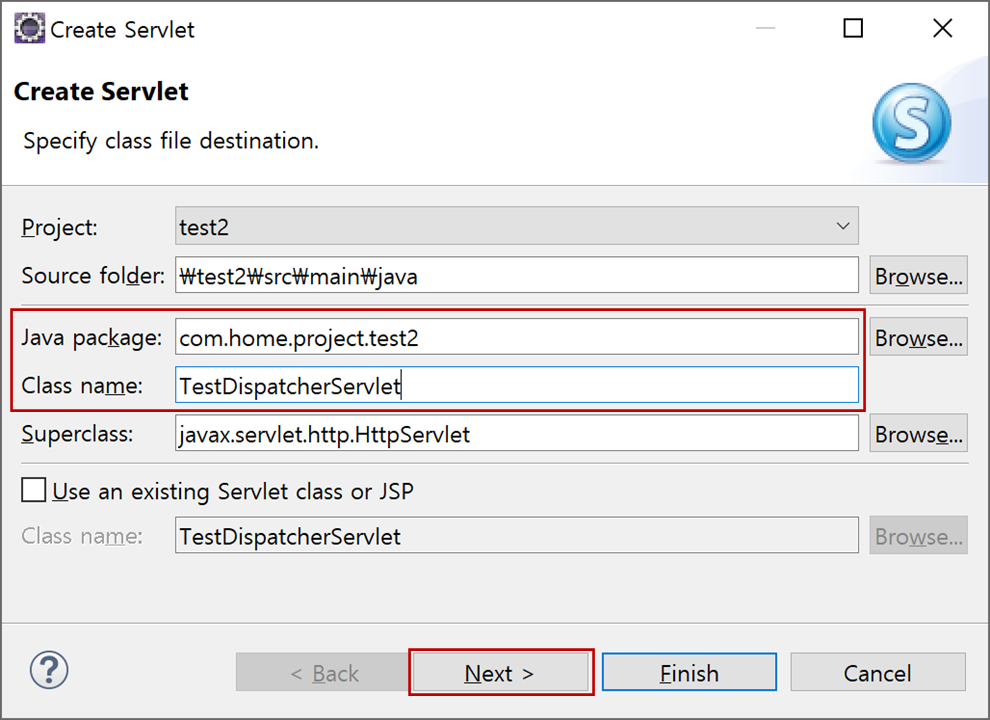 "Class name"은 서블릿명으로 "TestDispatcherServlet"을 입력합니다.