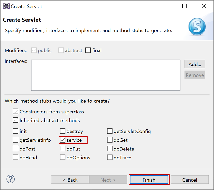 메소드 중에서 "service"를 체크하고 "doGet"과 "doPost"는 체크를 하지 않습니다. "Finish"버튼을 클릭합니다.