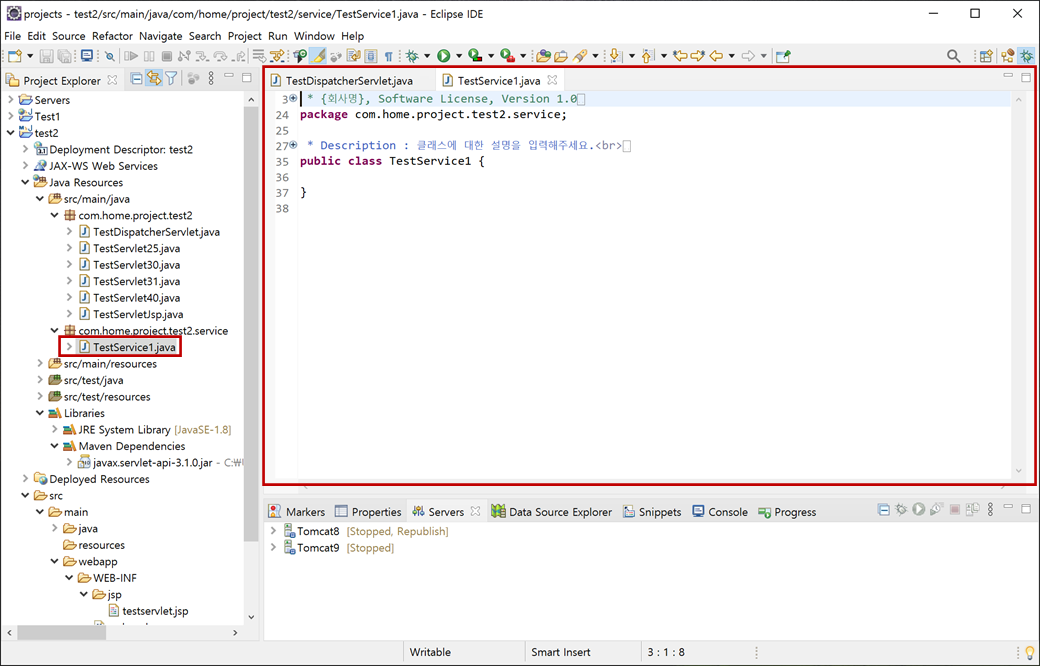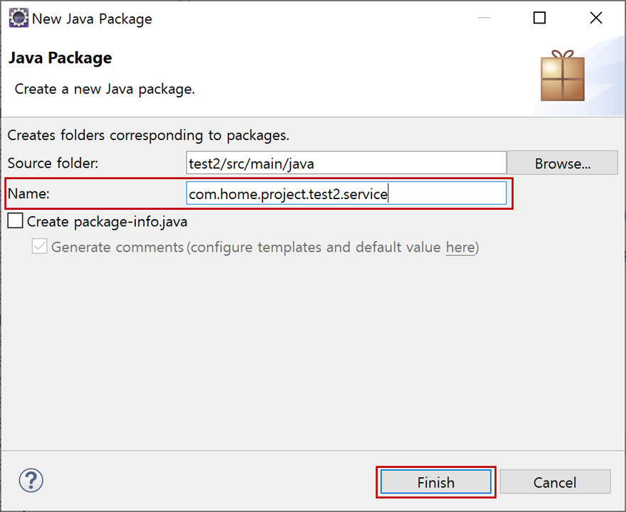"test2" 프로젝트의 "Java Resources"에서 "src/main/java"의 "com.hom.project.test2.service"에 "TestService1.java"파일이 생성됩니다.