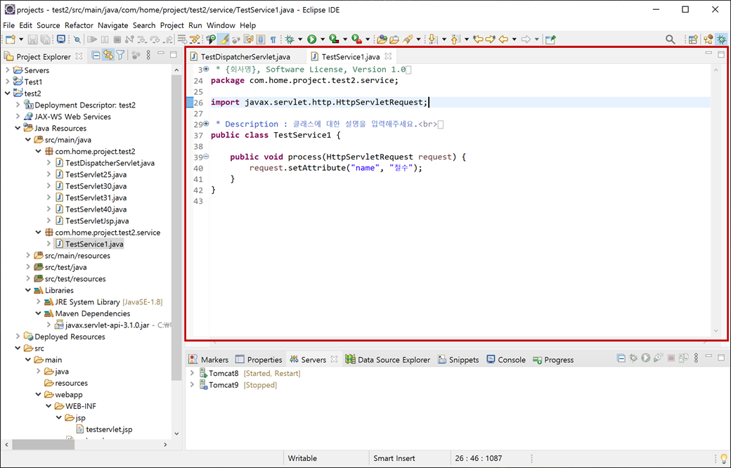 "RequestDispatcher"클래스와 "TestService1"클래스가 "import"되어 있지 않아서 오류가 납니다. 마우스를 "RequestDispatcher"클래스와 "TestService1"클래스 위로 이동하면 컨텍스트 메뉴가 나타납니다. 여기서 "import 'RequestDispatcher' (javax,servlet)"와 "import 'TestService1' (com.home.project.test2.service)"를 클릭하고 저장합니다.