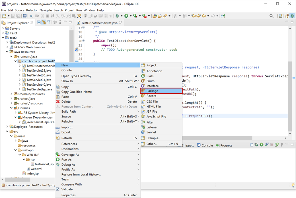 5. "test2" 프로젝트의 "Java Resources"에서 "src/main/java"의 "com.home.project.test2"를 선택한 후 오른쪽 버튼을 클릭하여 컨텍스트 메뉴 [New > Package]를 클릭합니다.