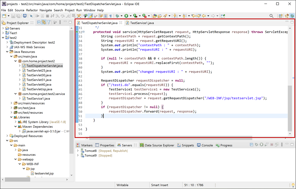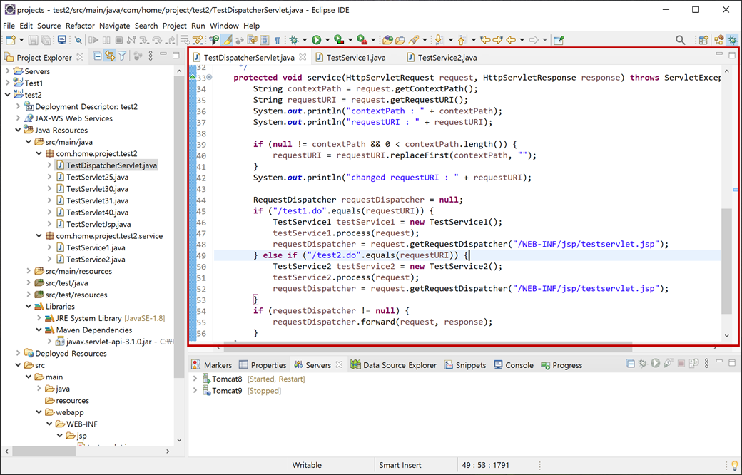 9. "TestDispatcherServlet.java"의 "service"메소드에 "test2.do"처리에 대한 코딩을 추가하고 저장합니다.