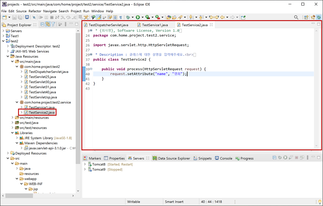 8. 위와 동일한 방식으로 "TestService2.java"를 만들고 "process"를 코딩하고 저장합니다.