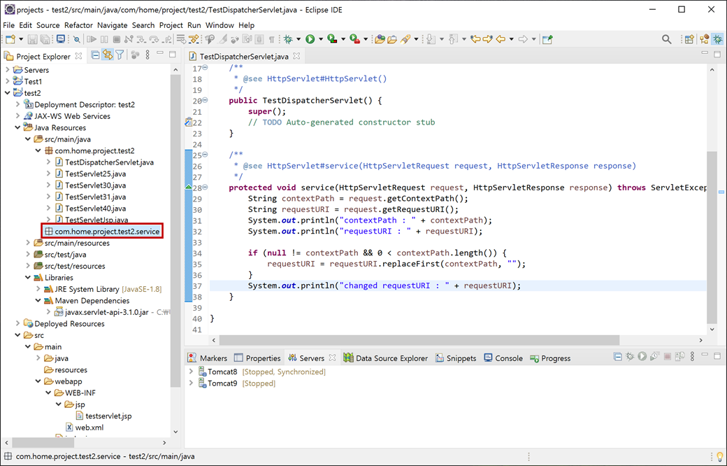 6. "TestDispatcherServlet.java"의 "service"메소드에 "RequestDispatcher"클래스와 "forward"를 이용하여 코딩합니다. 이전에 만들어 놓은 "testservlet.jsp"를 이용하겠습니다.