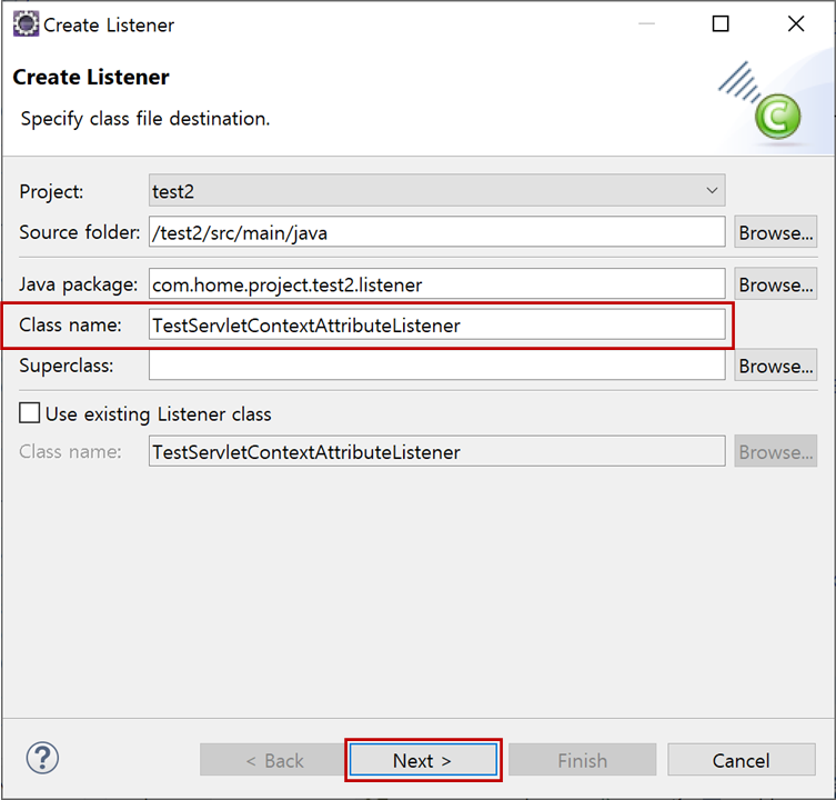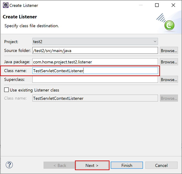 "Class name"에 "TestServletContextListener"를 입력하고 "Next >"버튼을 클릭합니다.