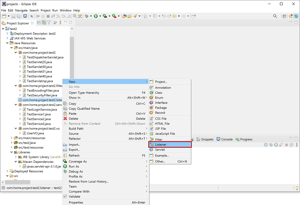 3. "test2" 프로젝트의 "Java Resources"에서 "src/main/java"의 "com.hom.project.test2.listener"에서 오른쪽 버튼을 클릭하여 컨텍스트 메뉴 [New > Listener]를 클릭합니다.