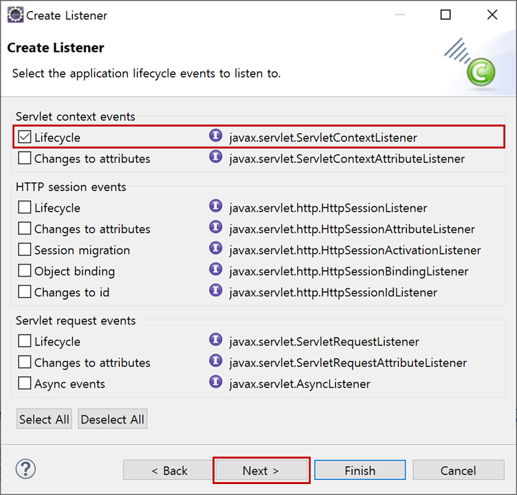 "Servlet context events"의 "Lifecycle"를 체크합니다.
