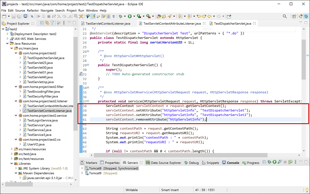 4. "TestDispatcherServlet.java"의 "service"에 "ServletContext"의 속성을 변경하여 이벤트가 발생하도록 코딩합니다.