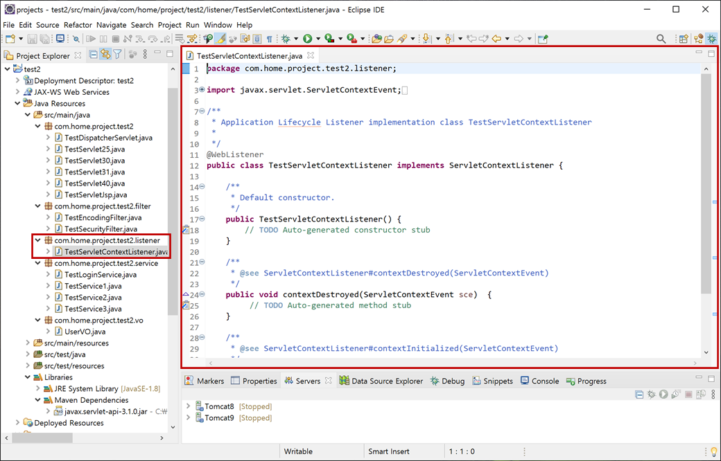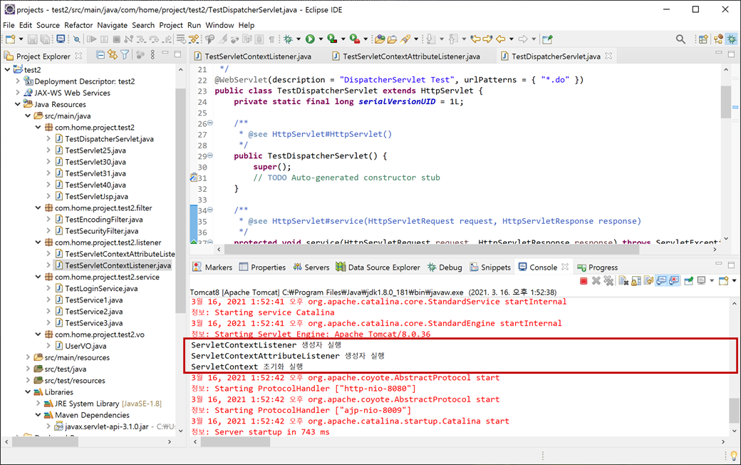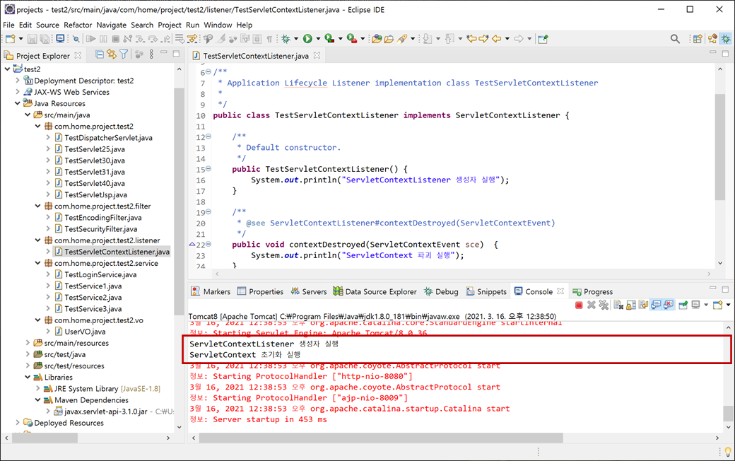 현재 "Dynamic Web Module 3.1"로 구성되어 있어 "TestServletContextListener.java"에 "@WebListener" 어노테이션을 사용하고 있습니다.
