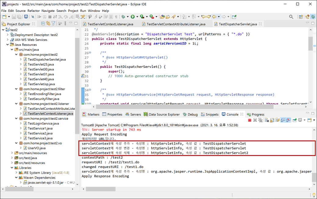 servletContext에 속성 변경 - 속성명 : httpServletInfo, 속성 값 : TestDispatcherServlet