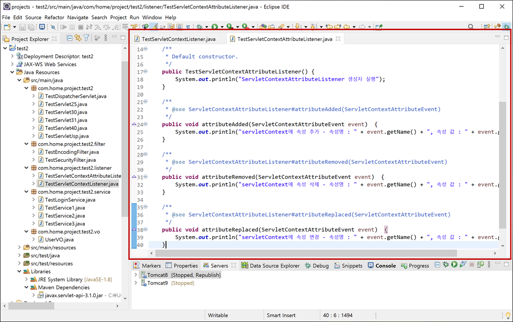 "TestServletContextAttributeListener.java"의 "constructor"와 "attributeAdded", "attributeRemoved", "attributeReplaced"에 출력문을 코딩하여 어느 시점에서 호출되는 지를 확인해하기 위해서입니다.