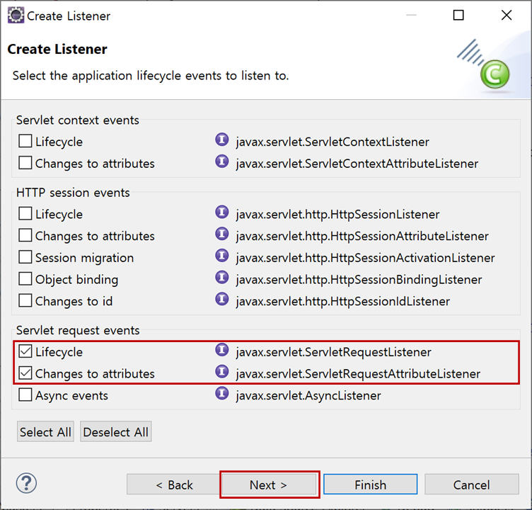 "Servlet request events"의 "Lifecycle", "Changes to attributes"를 체크합니다.
