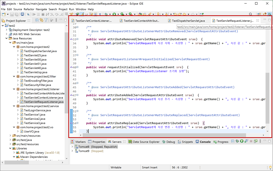 "TestServletRequestListener.java"의 "constructor"와 "requestInitialized", "attributeAdded", "attributeRemoved", "attributeReplaced", "requestDestroyed"에 출력문을 코딩하여 어느 시점에서 호출되는 지를 확인해하기 위해서입니다.