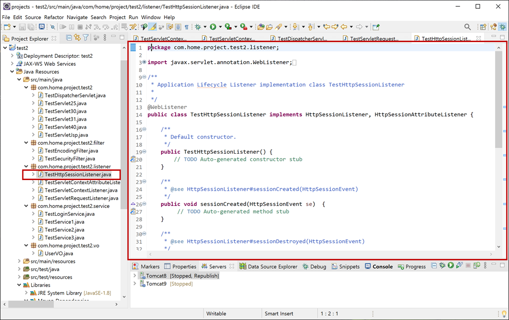 1. "test2" 프로젝트의 "Java Resources"에서 "src/main/java"의 "com.hom.project.test2.listener"에서 오른쪽 버튼을 클릭하여 컨텍스트 메뉴 [New > Listener]를 클릭합니다.