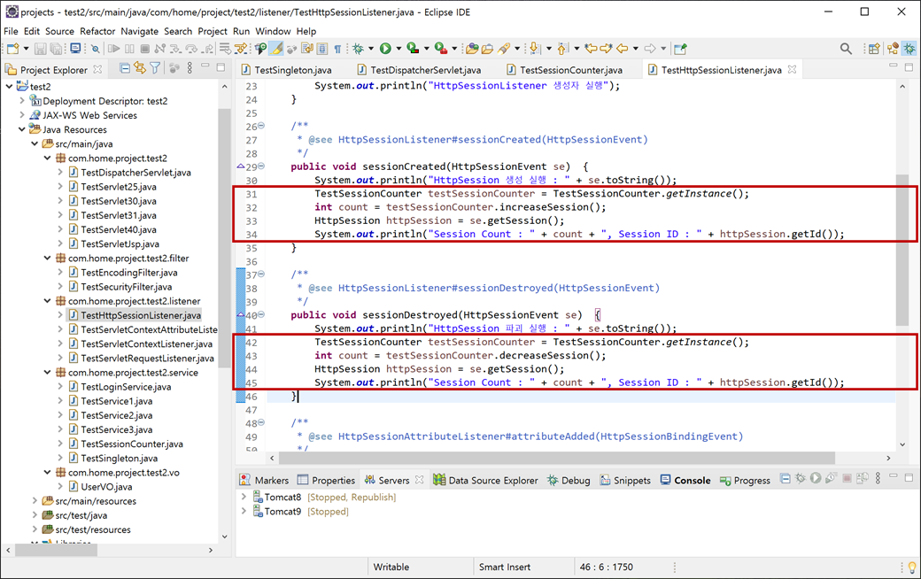 2. "HttpSessionListener"를 구현한 "TestHttpSessionListener.java"의 "sessionCreated", "sessionDestroyed"에 "TestSessionCounter" 연동을 추가합니다.