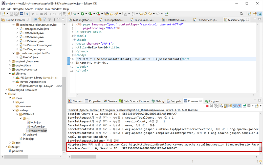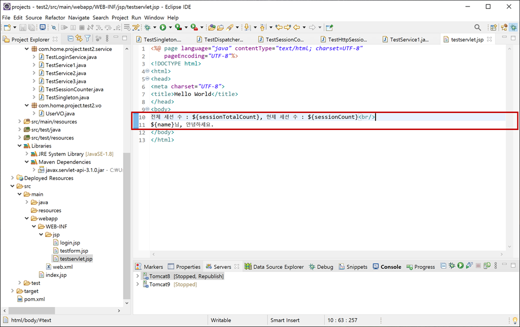 4. "testservlet.jsp"에 "request"속성에 있는 "sessionTotalCount"와 "sessionCount"를 EL (Expression Language) 방식으로 코딩하고 저장합니다.