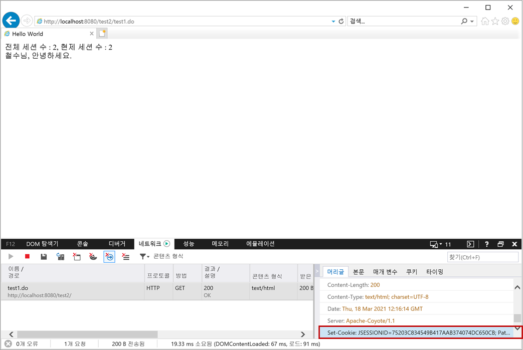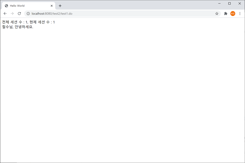 6. 두 개의 웹 브라우저(크롬과 IE)를 사용하여 세션을 확인해 보겠습니다. 현재 크롬 웹 브라우저에서 "http://localhost:8080/test2/test1.do"를 새로고침 합니다.