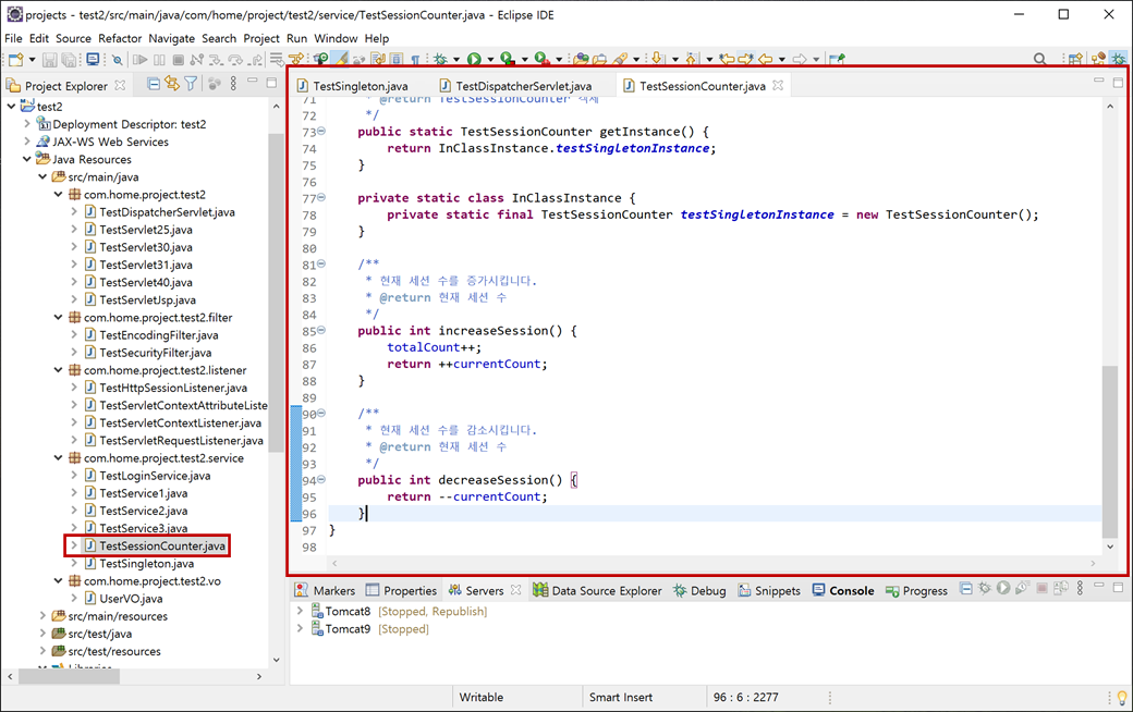 "test2" 프로젝트의 "Java Resources"에서 "src/main/java"의 "com.hom.project.test2.service"에 "TestSessionCounter.java"파일이 생성됩니다.