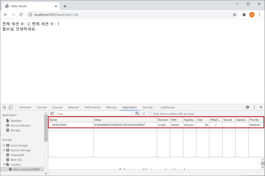 웹 브라우저에서 "F12"키를 누르면 "개발자 도구"가 나타납니다. "개발자 도구"의 메뉴에서 "Application"를 선택하고 왼쪽의 "Storage"에 "Cookies"의 "http://localhost:8080"를 클릭하면 "JSESSIONID"이라는 세션을 확인할 수 있습니다.