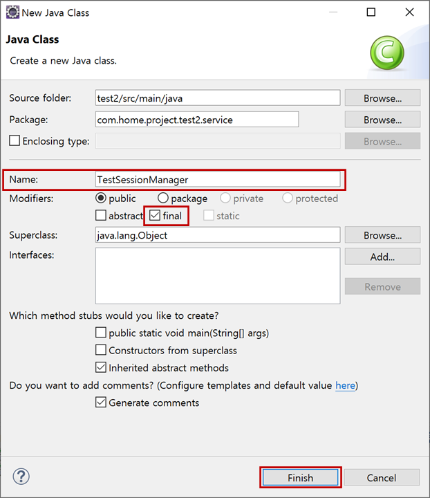 "New Java Class"창의 "Name"에 "TestSessionManager"를 입력하고 "Modifiers"의 "final"를 체크하고 "Finish"버튼을 클릭합니다.