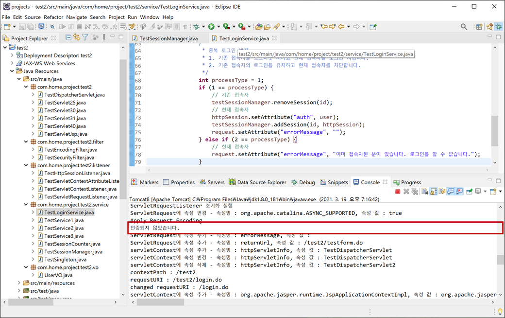 기존 접속자의 세션을 무효화(invalidate)되어 HttpSession이 파괴되고 "TestSessionManager"에서 제가 됩니다. 현재 접속자를 "TestSessionManager"에 추가됩니다.