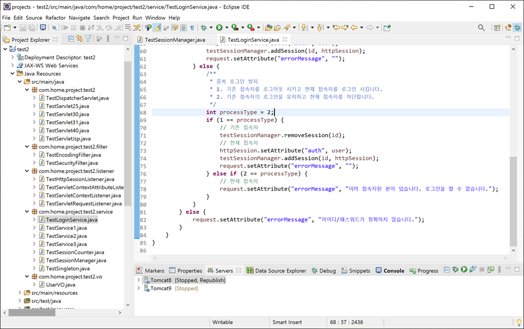 4. "TestLoginService"의 "process"메서드에서 "processType"를 "1"에서 "2"로 변경하고 저장합니다.
