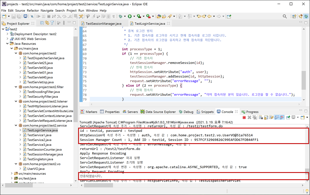 2. 로그인 처리를 하는 "TestLoginService.java"의 "process"메서드에 "TestSessionManager" 연동을 추가합니다.