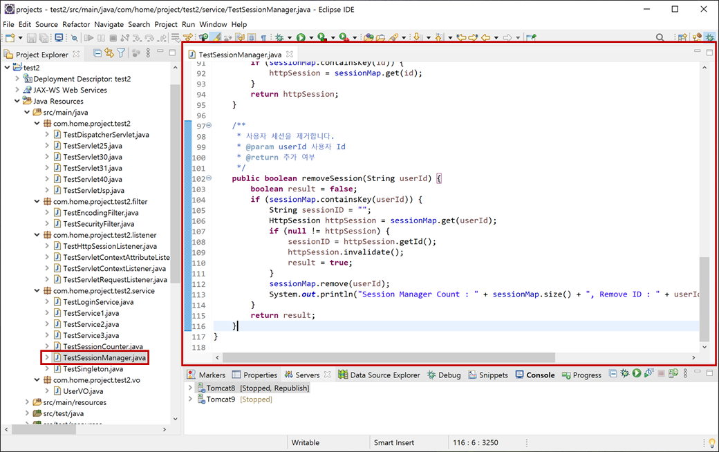 "test2" 프로젝트의 "Java Resources"에서 "src/main/java"의 "com.hom.project.test2.service"에 "TestSessionManager.java"파일이 생성됩니다.