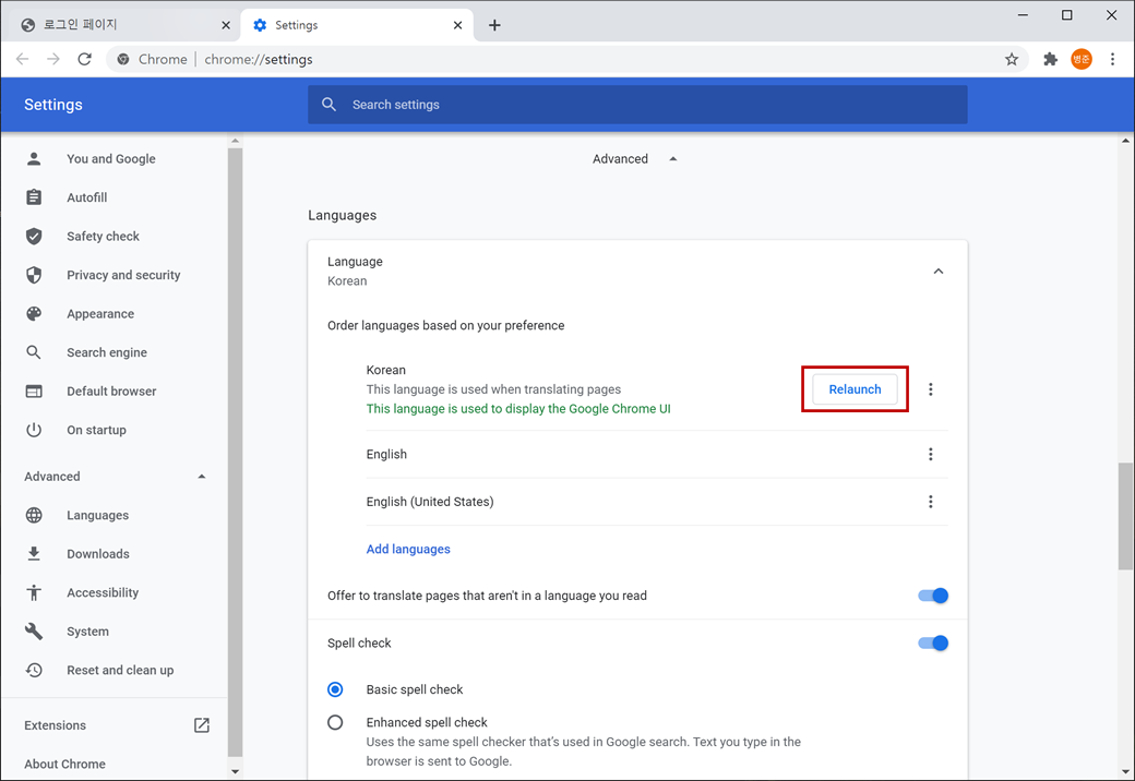 웹 브라우저가 다시 시작되면서 한국어로 변경됩니다.