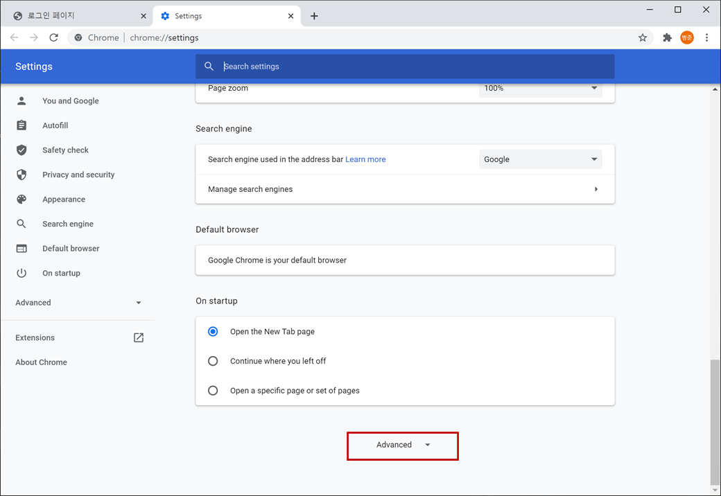 웹 브라우저의 오른쪽 상단에 있는 "제어"버튼을 클릭한 후 "settings"를 클릭합니다. 그리고 설정에서 아래로 스크롤해서 "Advanced"버튼을 클릭합니다.
