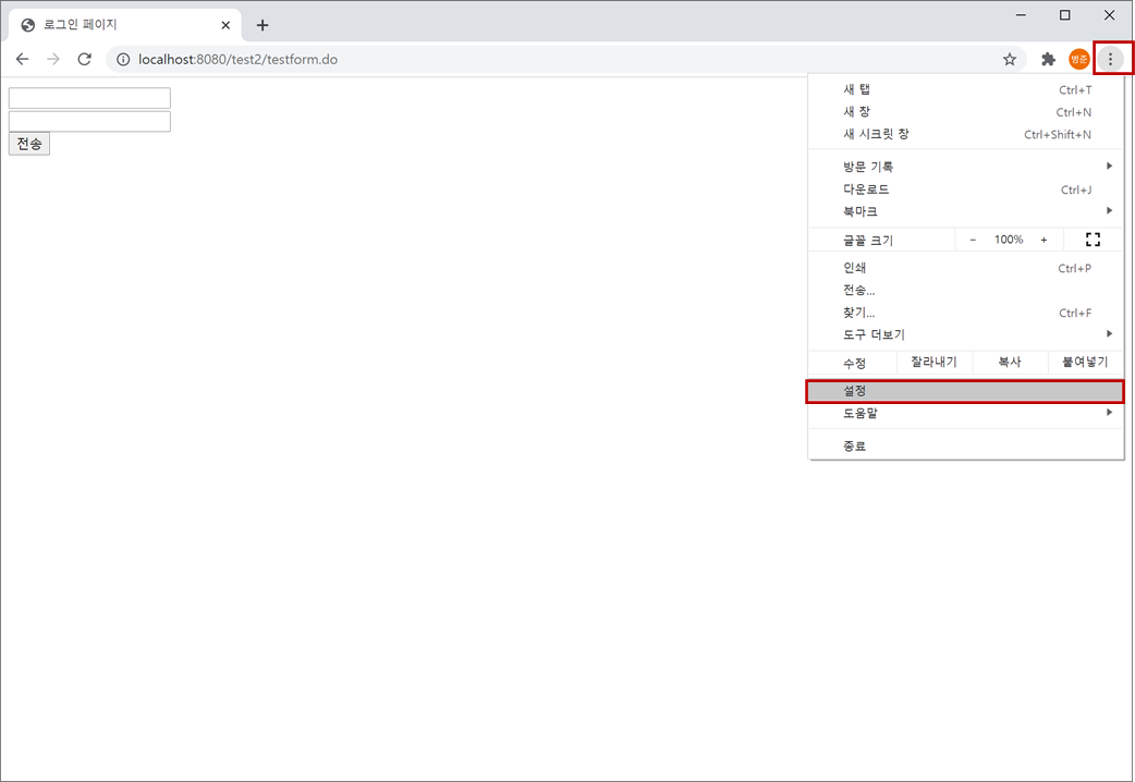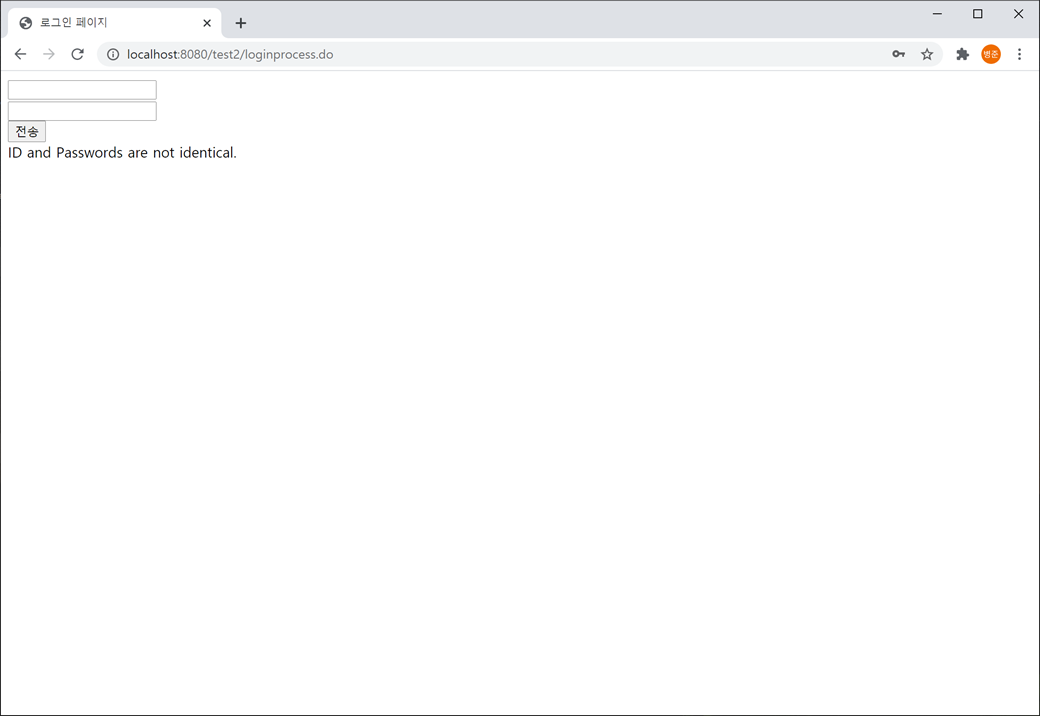 6. 웹 브라우저에서 "http://localhost:8080/test2/testform.do"를 입력합니다. 첫번째 입력란은 아이디로 "1"를 두번째 입력란은 패스워드로 "2"를 입력하고 "전송"버튼을 누릅니다.