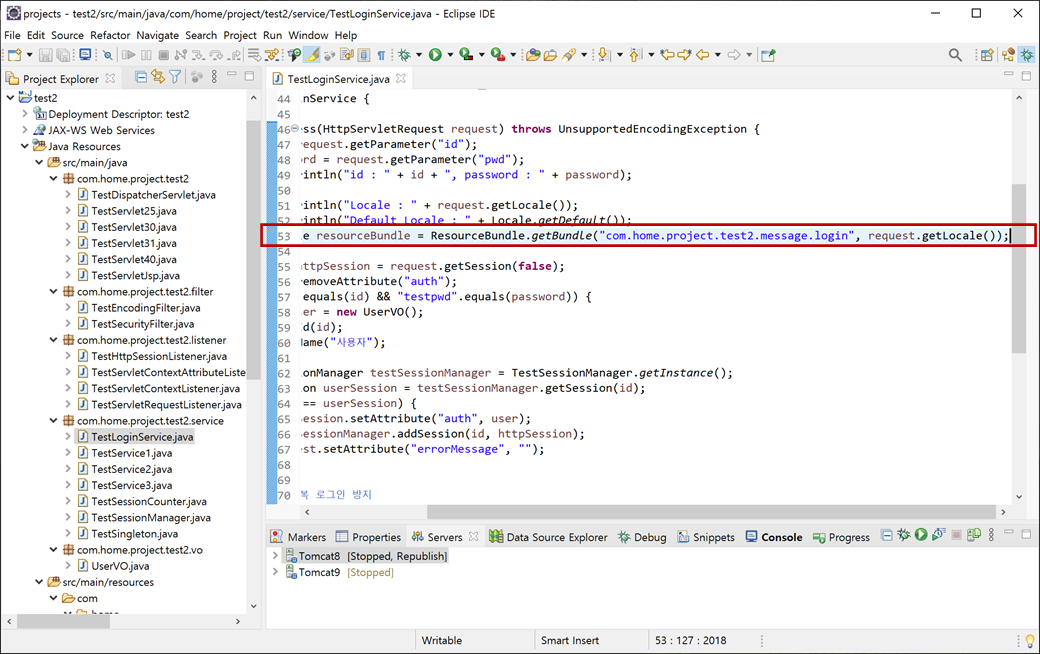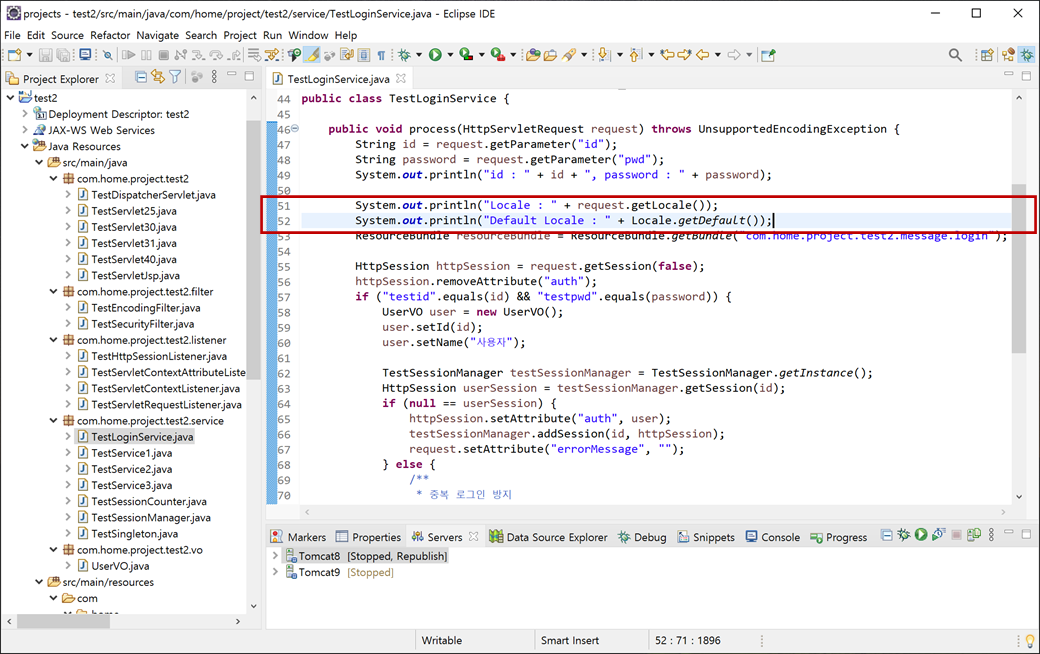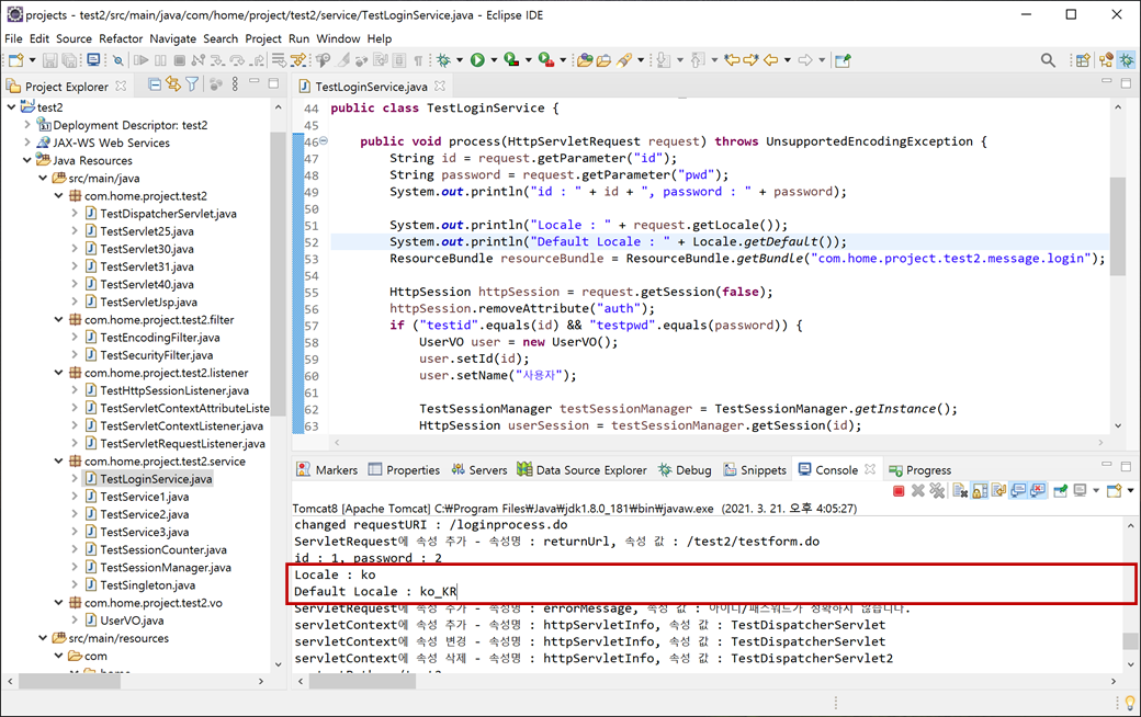 1. "TestLoginService.java"에 웹 브라우저와 시스템 JVM의 로케일(locale)를 확인하는 코딩을 추가하고 저장합니다.