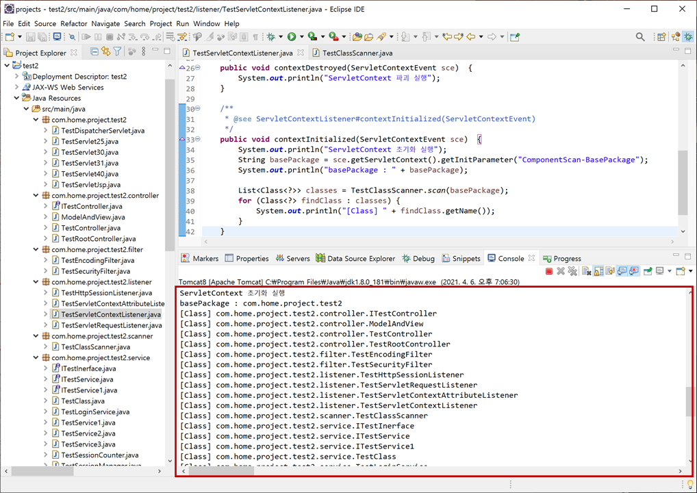 "Console"탭을 클릭하면 지금까지 "com.home.project.test2"를 베이스로 만들어진 모든 클래스들이 로드되어 출력된 것을 확인할 수 있습니다.