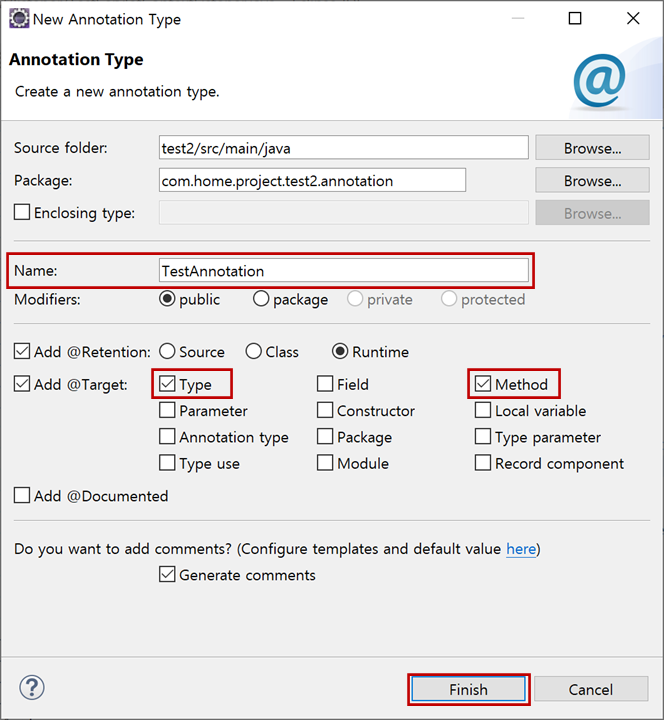 "Name"에 "TestAnnotation"를 입력하고 "@Retention"은 "Runtime", "@Target"은 "Type", "Method"를 선택하고 "Finish"버튼을 클릭합니다.